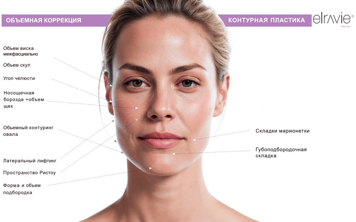 Скулы, щеки / средняя часть лица Подбородок, линия челюсти / носогубные складки/ морщины марионетки |